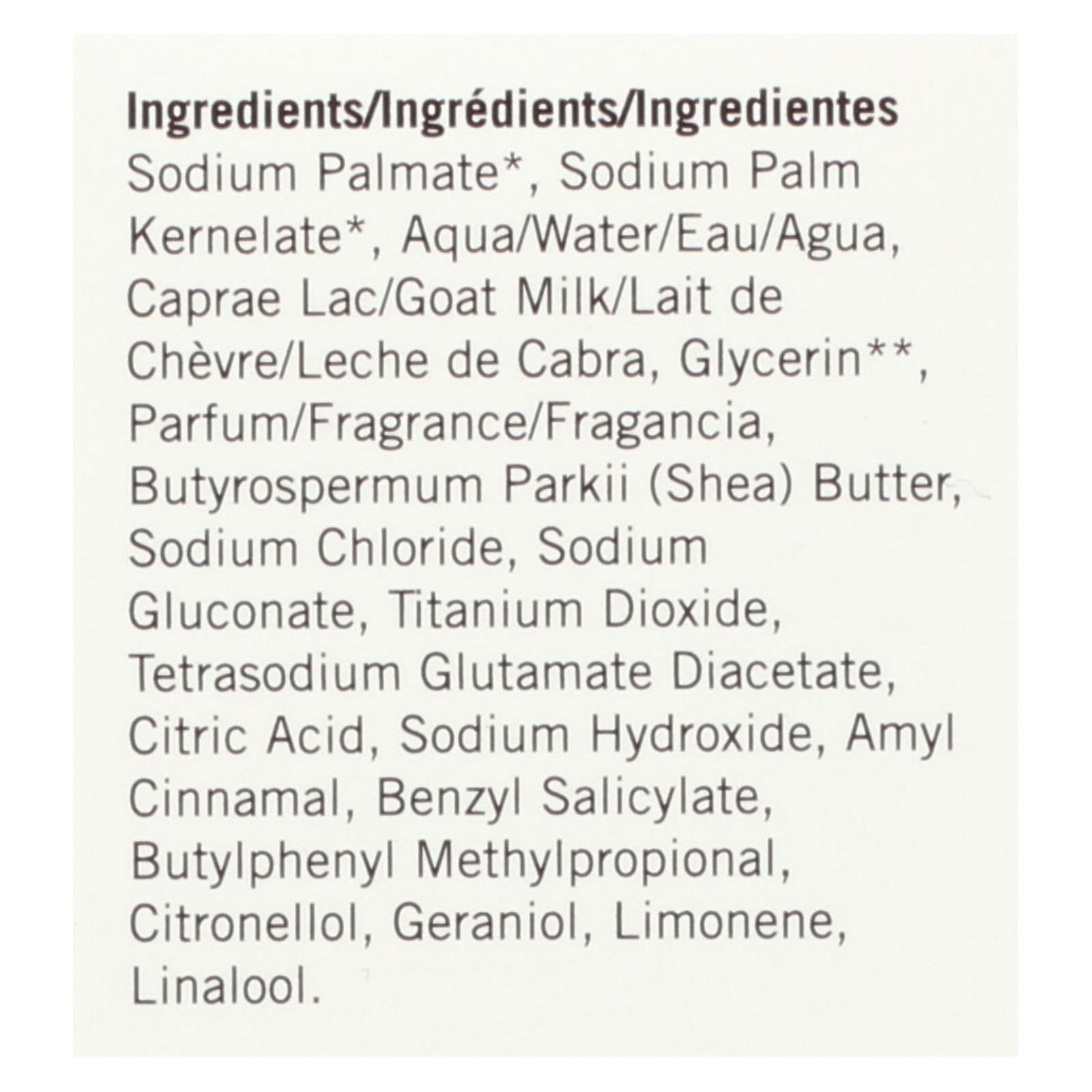 ingredients : sodium palmate;sodium palm kernelate;water;goat milk;glycerin;fragrance;butyrospermum parkii;shea;butter;sodium chloride;sodium gluconate;titanium dioxide;tetrasodium glutamate diacetate;citric acid;sodium hydroxide;amyl cinnamal;benzyl salicylate;butylphenyl methylpropional;citronellol;geraniol;limonene;linalool