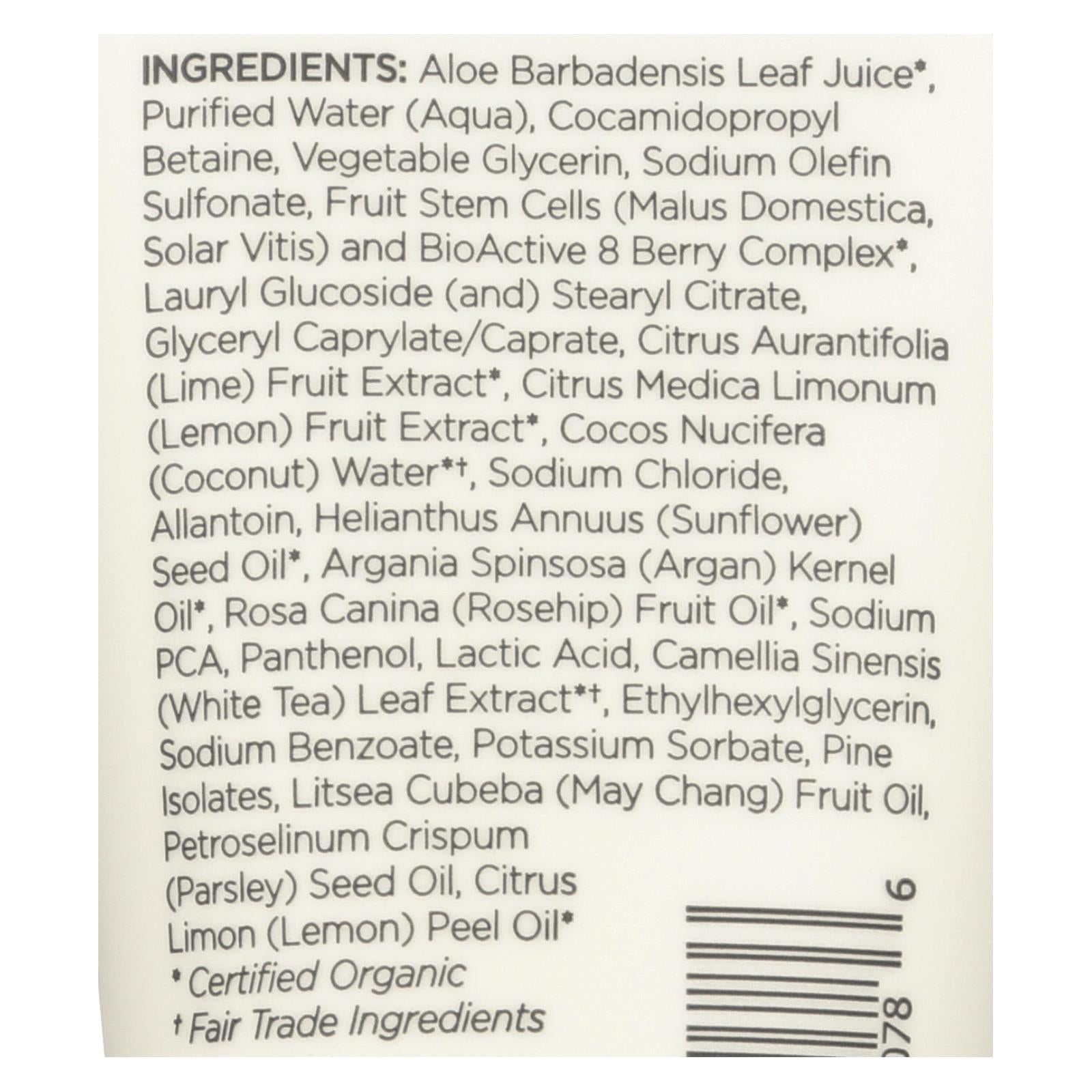 ingredients : aloe barbadensis leaf juice;purified water;aqua;cocamidopropyl betaine;vegetable glycerin;sodium olefin sulfonate;fruit stem cells;malus domestica;solar vitis;and bioactive 8 berry complex;lauryl glucoside;and;stearyl citrate;glyceryl caprylate/caprate;citrus aurantifolia;lime;fruit extract;citrus medica limonum;lemon;cocos nucifera;coconut;water;sodium chloride;allantoin;helianthus annuus;sunflower;seed oil;argania spinsosa;argan;kernel oil;rosa canina;rosehip;fruit oil;sodium pca;panthenol;lac