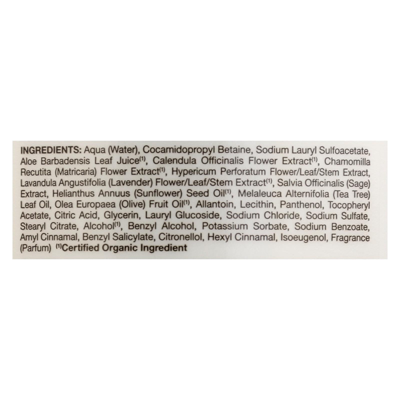 ingredients : aqua;water;cocamidopropyl betaine;sodium lauryl sulfoacetate;aloe barbadensis leaf juice⁽¹⁾;calendula officinalis flower extract⁽¹⁾;chamomilla recutita;matricaria;flower extract⁽¹⁾;hypericum perforatum flower/leaf/stem extract;lavandula angustifolia;lavender;flower/leaf/stem extract⁽¹⁾;salvia officinalis;sage;extract;helianthus annuus;sunflower;seed oil⁽¹⁾;melaleuca alternifolia;tea tree;leaf oil;olea europaea;olive;fruit oil⁽¹⁾;allantoin;lecithin;panthenol;tocopheryl acetate;citric acid;glyceri
