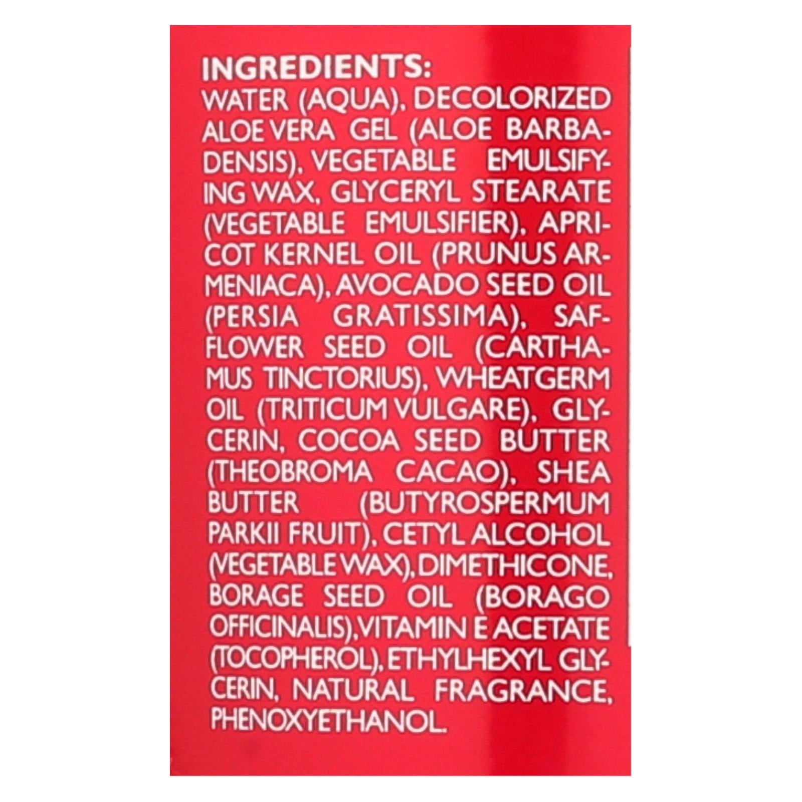 ingredients : water;aqua;decolorized aloe vera gel;aloe barbadensis;vegetable emulsifying wax;glyceryl stearate;vegetable emulsifier;apricot kernel oil;prunus armeniaca;avocado seed oil;persia gratissima;safflower seed oil;carthamus tinctorius;wheatgerm oil;triticum vulgare;glycerin;cocoa seed butter;theobroma cacao;shea butter;butyrospermum parkii fruit;cetyl alcohol;vegetable wax;dimethicone;borage seed oil;borago officinalis;vitmain e acetate;tocopherol;ethylhexyl glycerin;natural fragrance;phenoxyethanol