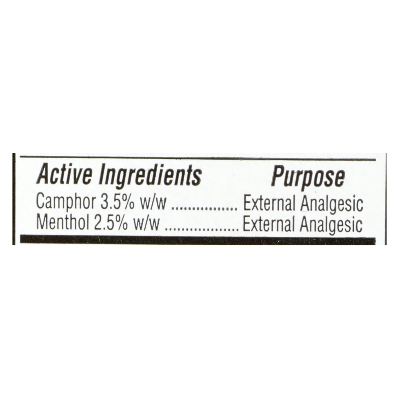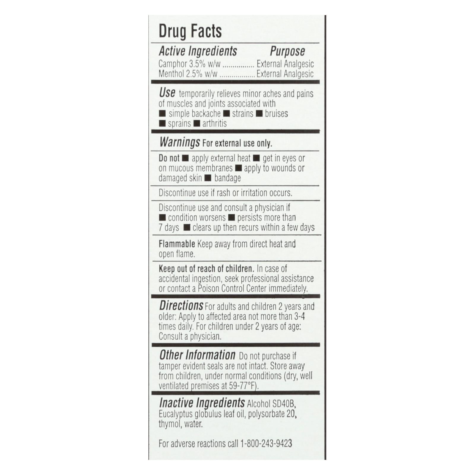 ingredients : alcohol sd40b;eucalyptus globulus leaf oil;polysorbate 20;thymol;water;camphor 3.5% w/w purpose external analgesic menthol 2.5% w/w purpose external analgesic
