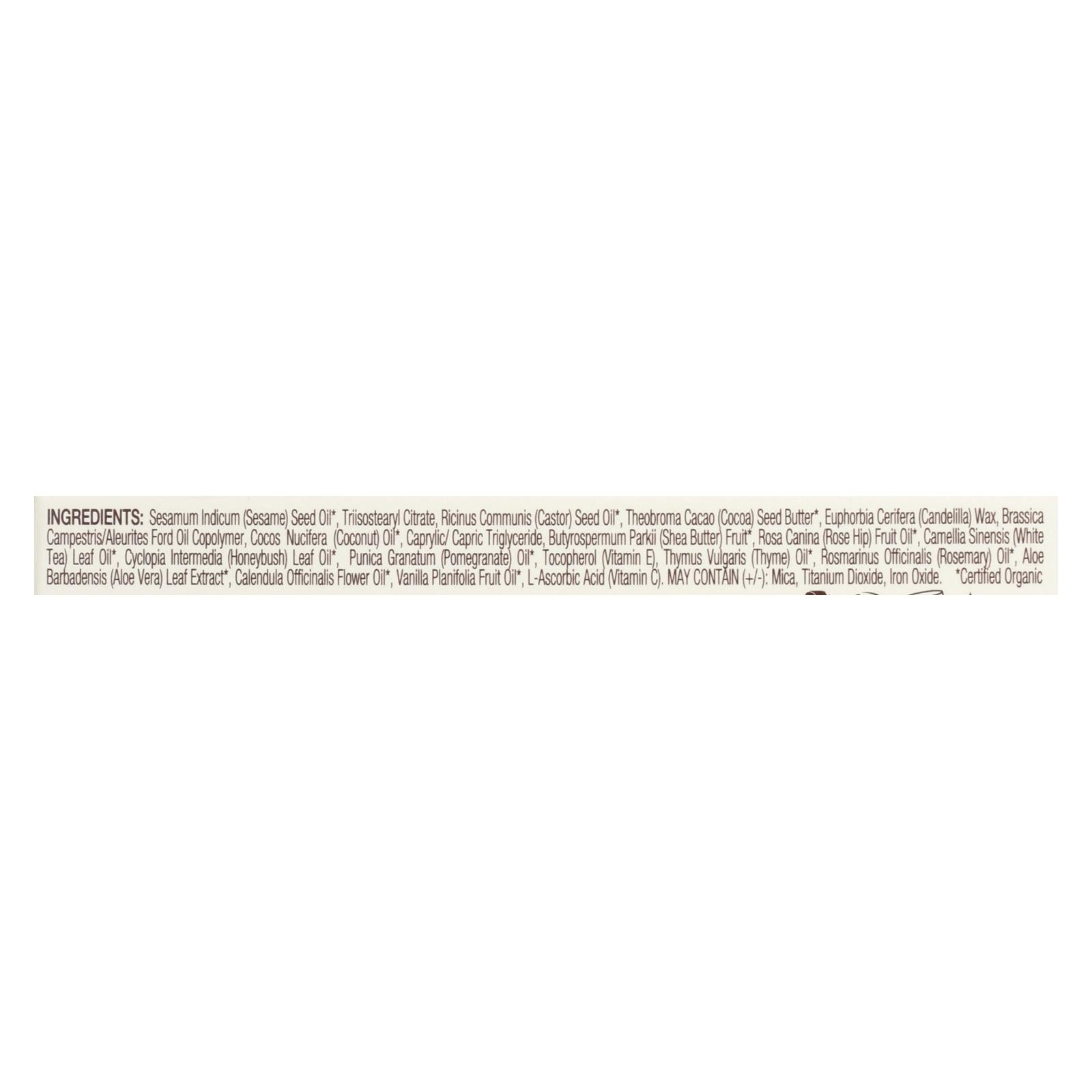 ingredients : sesamum indicum;sesame;seed oil;triisostearyl citrate;ricinus communis;castor;theobroma cacao;cocoa;seed butter;euphorbia cerifera;candelilla;wax;brassica campestris/aleurites ford oil copolymer;cocos nucifera;coconut;oil;caprylic/capric triglyceride;butyrospermum parkii;shea butter;fruit;rosa canina;rose hip;fruit oil;camellia sinensis;white tea;leaf oil;cyclopia intermedia;honeybush;punica granatum;pomegranate;tocopherol;vitamin e;thymus vulgaris;thyme;tosmarinus officinalis;rosemary;aloe barb