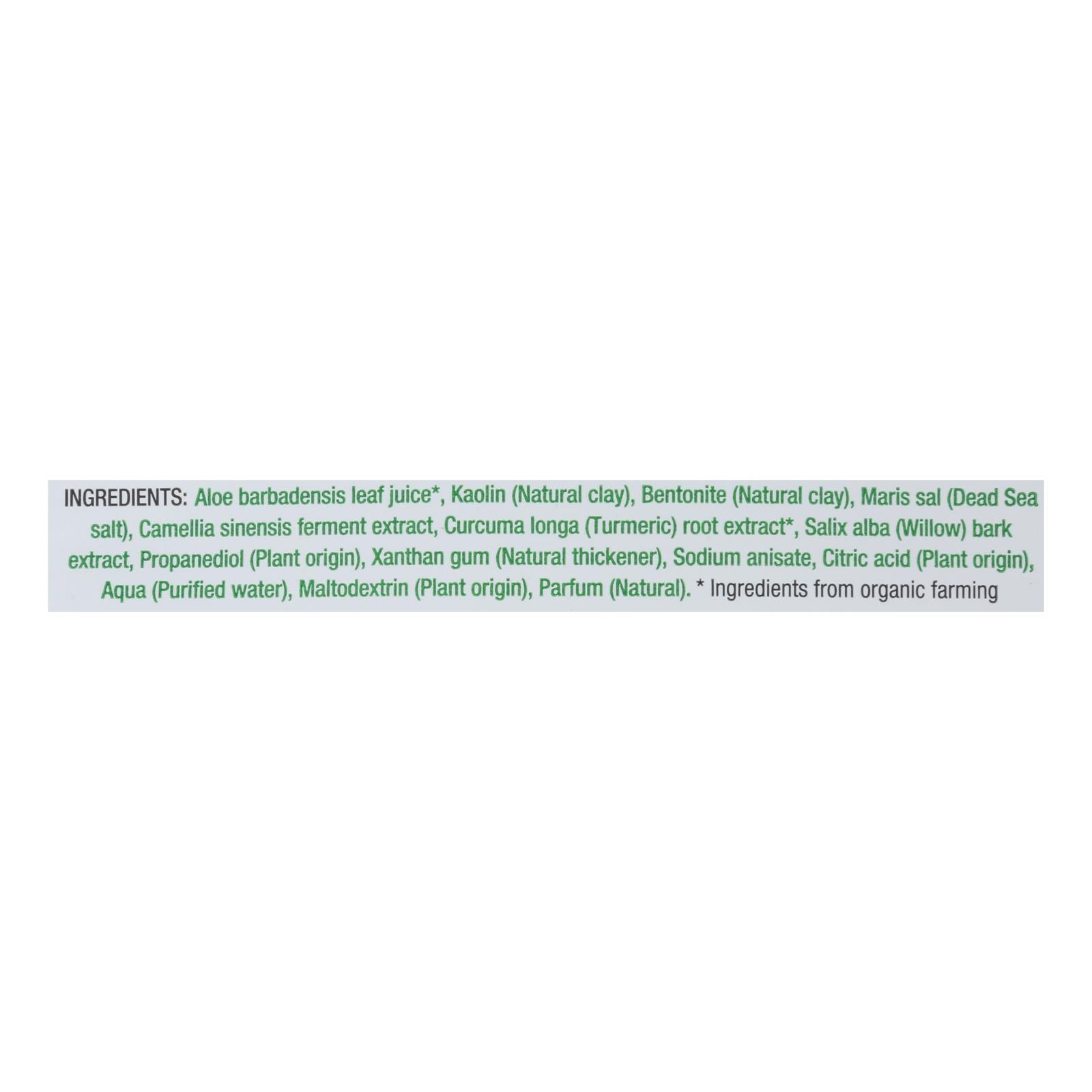 ingredients : aloe barbadensis leaf juice;kaolin (natural clay);bentonite (natural clay);maris sal (dead sea salt);camellia sinensis ferment extract;curcuma longa (turmeric) root extract;salix alba (willow) bark extract;propanediol (plant origin);xanthan gum (natural thickener);sodium anisate;citric acid (plant origin);aqua (purified water);maltodextrin (plant origin);parfum (natural)