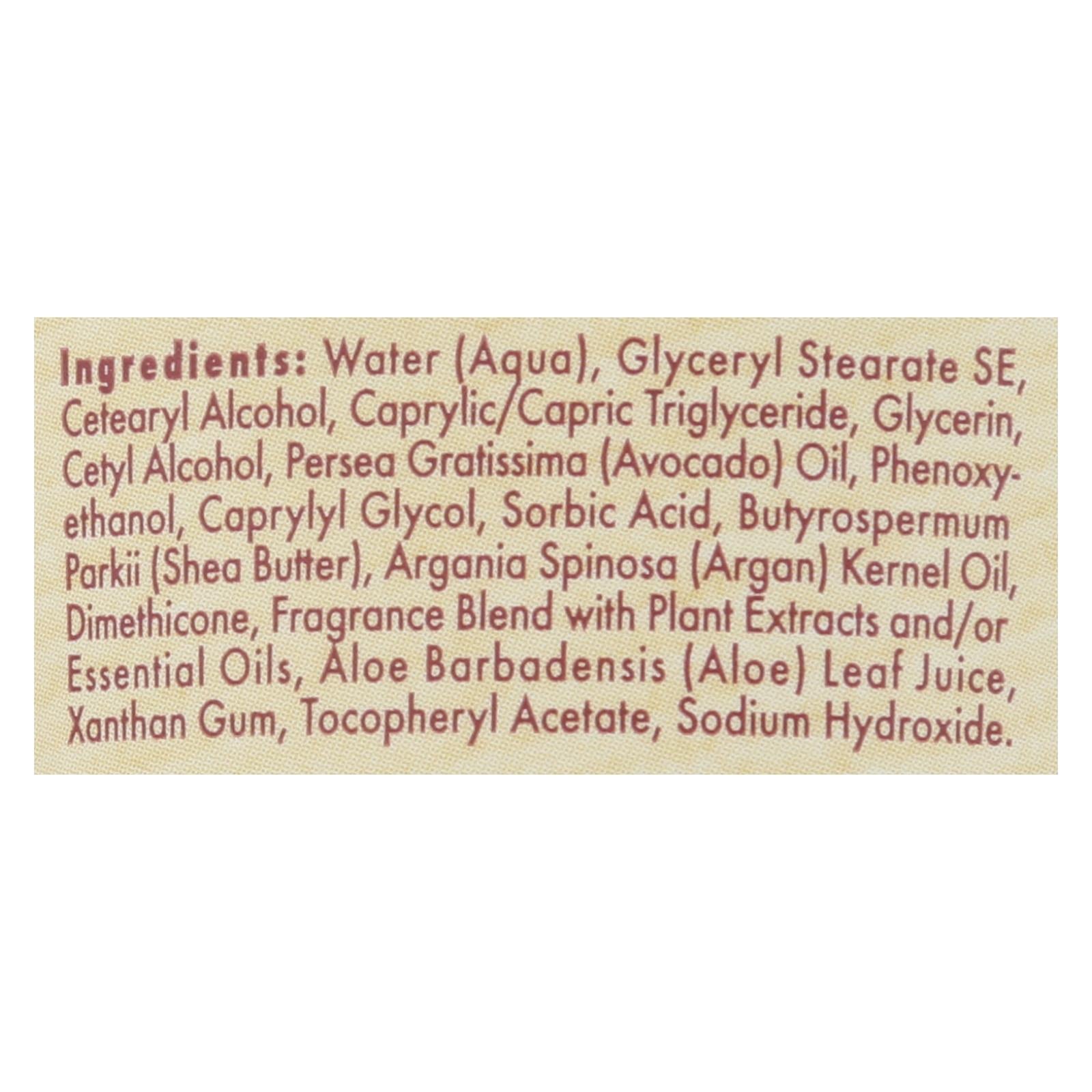 ingredients : water;aqua;glyceryl stearate se;cetearyl alcohol;caprylic/capric triglyceride;glycerin;cetyl alcohol;persea gratissima;avocado;oil;phenoxyethanol;caprylyl glycol;sorbic acid;butyrospermum parkii;shea butter;argania spinosa;argan;kernel oil;dimethicone;fragrance blend with plant extracts and/or essential oils;aloe barbadensis;aloe;leaf juice;xanthan gum;tocopheryl acetate;sodium hydroxide