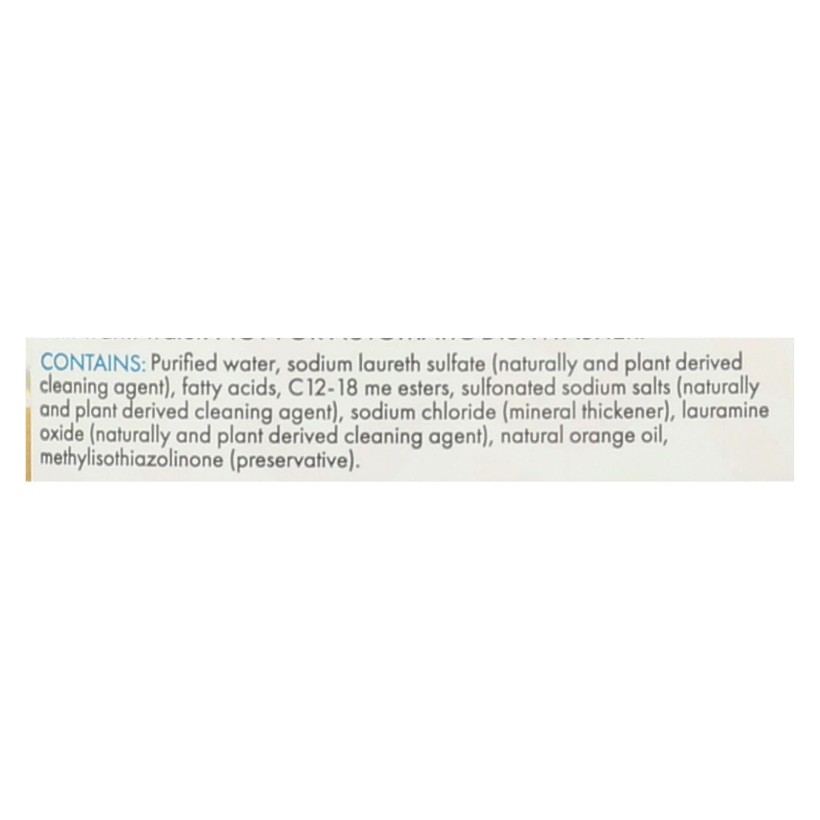 ingredients : contains: purified water;sodium laureth sulfate;naturally and plant derived cleaning agent;fatty acids;c12-18 me esters;sulfonated sodium salts;sodium chloride;mineral thickener;lauramine oxide;natural orange oil;methylisothiazolinone;preservative
