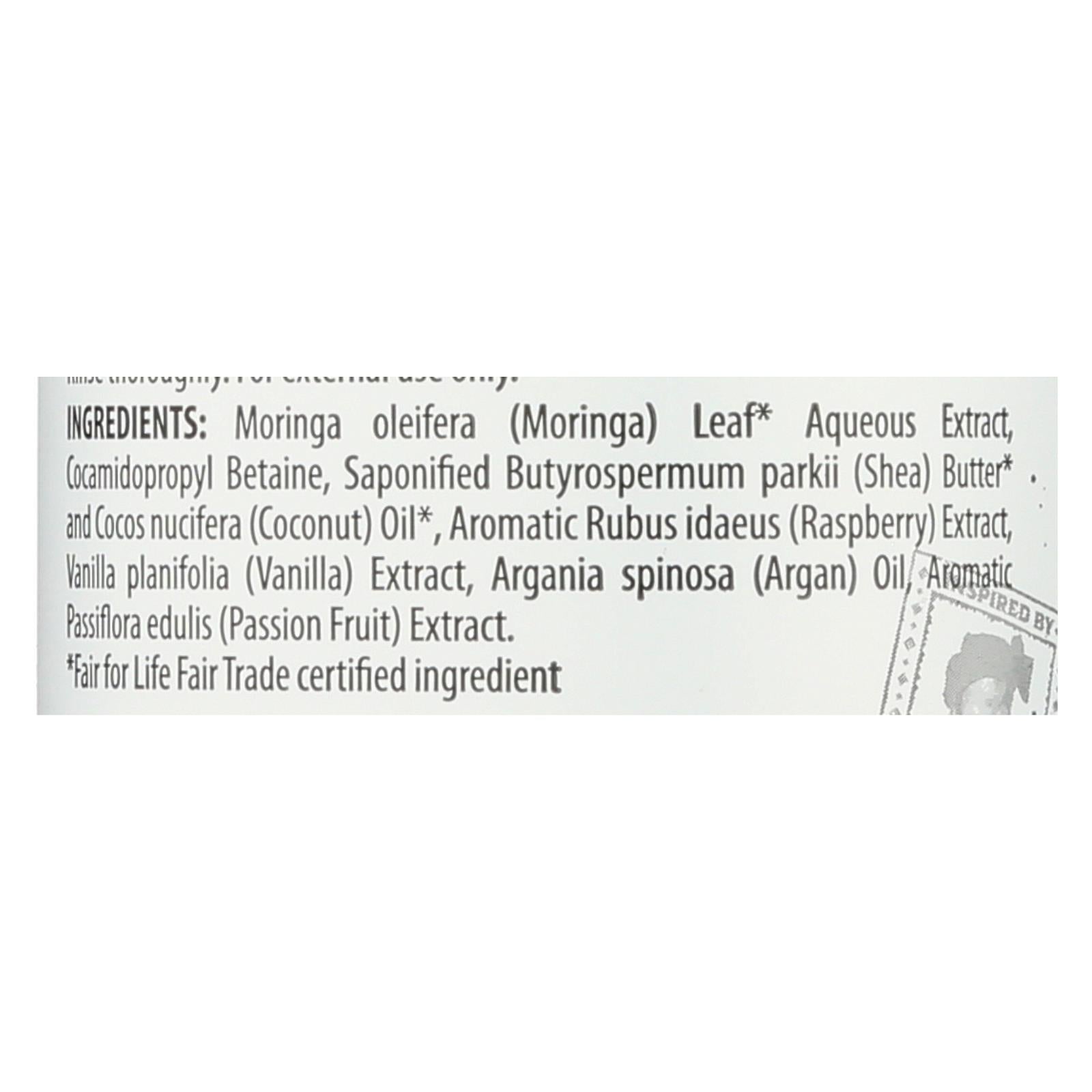 ingredients : moringa oleifera;moringa;leaf aqueous extract;saponified butyrospermum parkii;shea;butter and cocos nucifera;coconut;oil;coco-betaine;rubus idaeus;raspberry;extract;vanilla planifolia;vanilla;argania spinosa;argan;fragrance;natural fragrance;a blend of extracts;essential oils and other natural