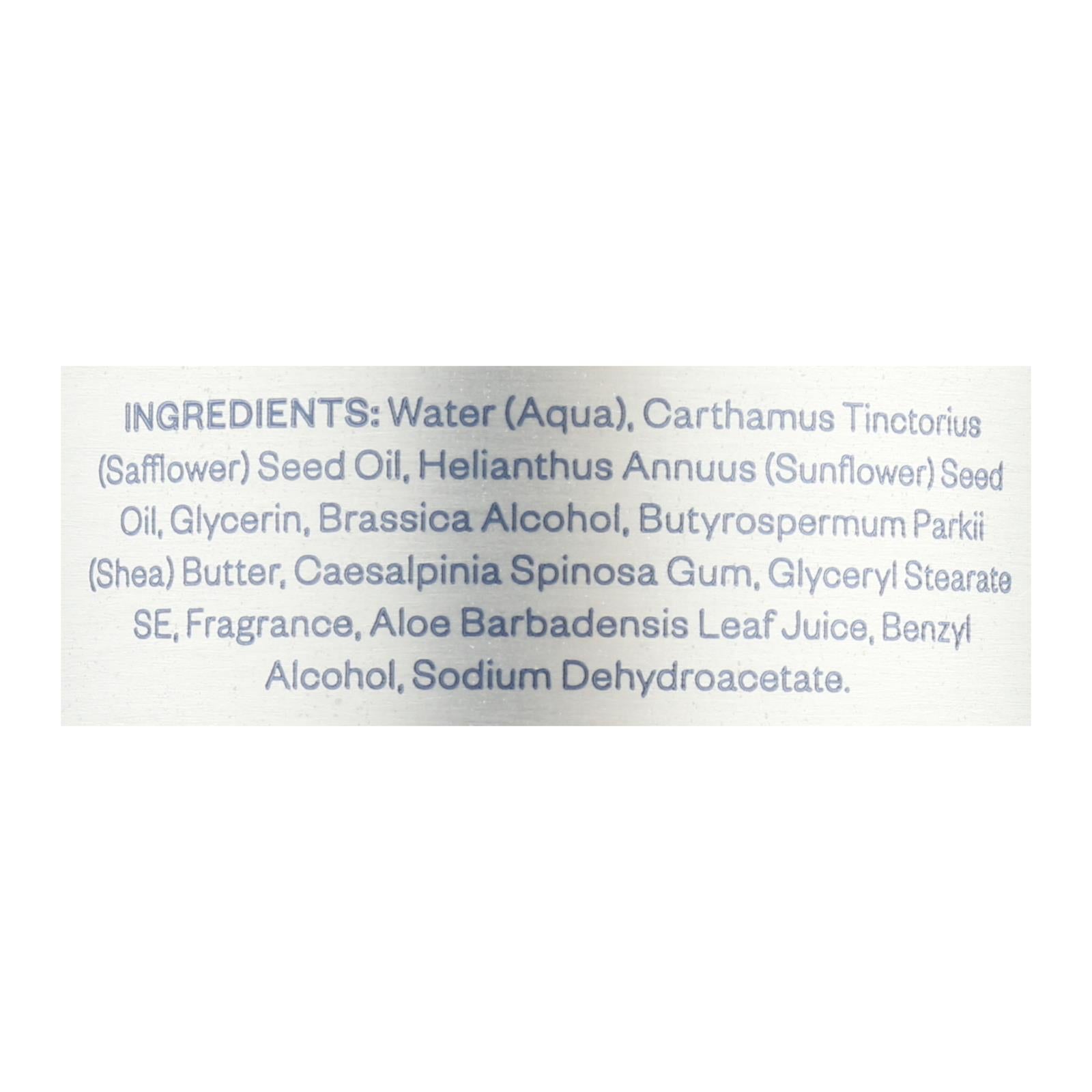 ingredients : water (aqua);carthamus tinctorius (safflower) seed oil;helianthus annuus (sunflower) seed oil;glycerin;brassica alcohol;butyrospermum parkii (shea) butter;caesalpinia spinosa gum;glyceryl stearate se;fragrance;aloe barbadensis leaf juice;benzyl alcohol;sodium dehydroacetate