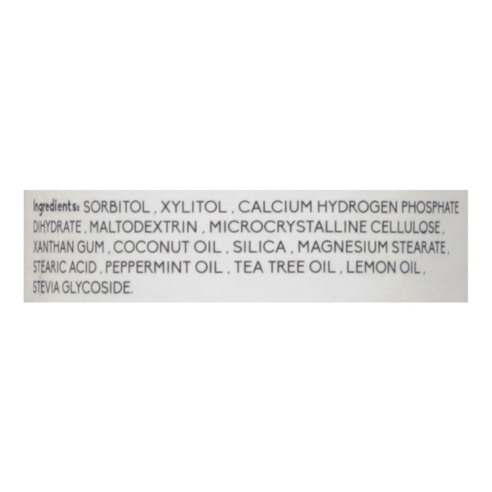 ingredients : sorbitol;xylitol;dicalcium phosphate dihydrate;maltodextrin;microcrystalline cellulose;xanthan gum;cocos nucifera oil;silica;magnesium stearate;stearic acid;peppermint (mentha x piperita l.) oil;melaleuca alternafolia (tea tree) leaf oil;citrus limon (lemon) peel oil;rebaudiosidea