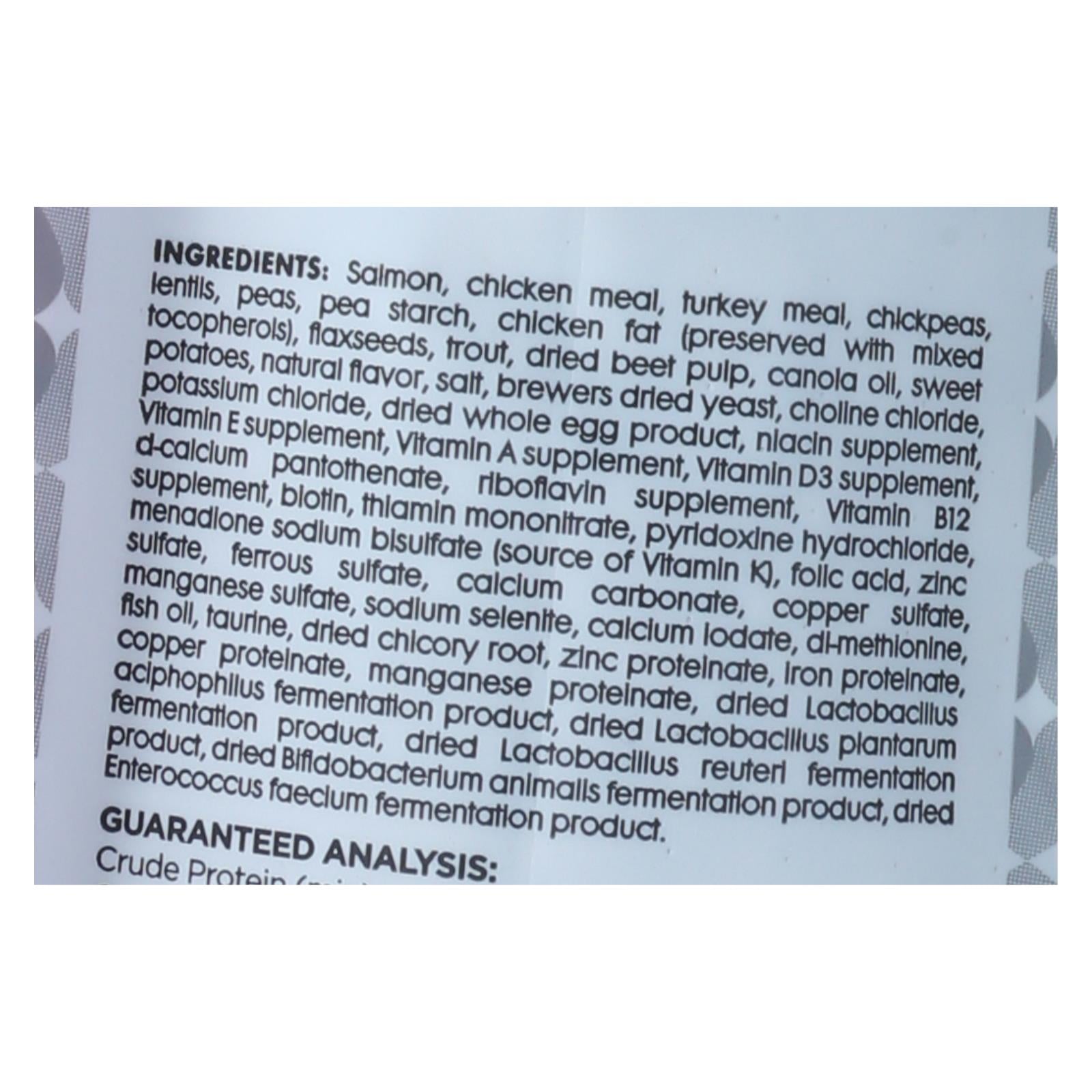 ingredients : salmon;chicken meal;turkey meal;chickpeas;lentils;peas;pea starch;chicken fat;preserved with mixed tocopherols;flaxseeds;trout;dried beet pulp;canola oil;sweet potatoes;natural flavor;salt;brewers dried yeast;choline chloride;potassium chloride;dried whole egg product;niacin supplement;vitamin e supplement;vitamin a supplement;vitamin d3 supplement;d-calcium pantothenate;riboflavin supplement;vitamin b12 supplement;biotin;thiamin mononitrate;pyridoxine hydrochloride;menadione sodium bisulfate;so