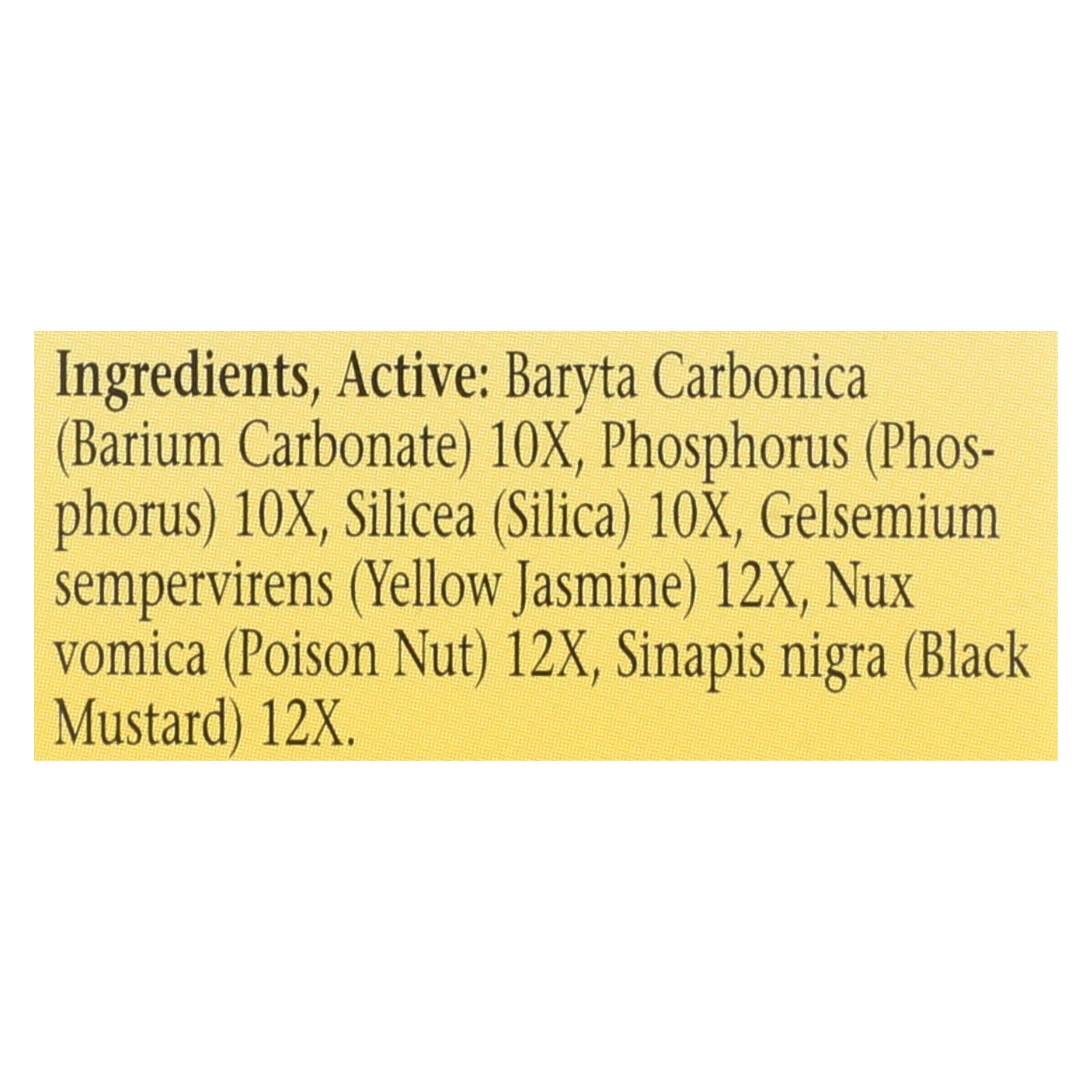 ingredients : baryta carbonica;barium carbonate;10x;phosphorus;silicea;silica;gelsemium sempervirens;yellow jasmine;12x;nux vomica;poison nut;sinapis nigra;black mustard;cellulose;dextrose;lactose;magnesium stearate;natural apple flavor
