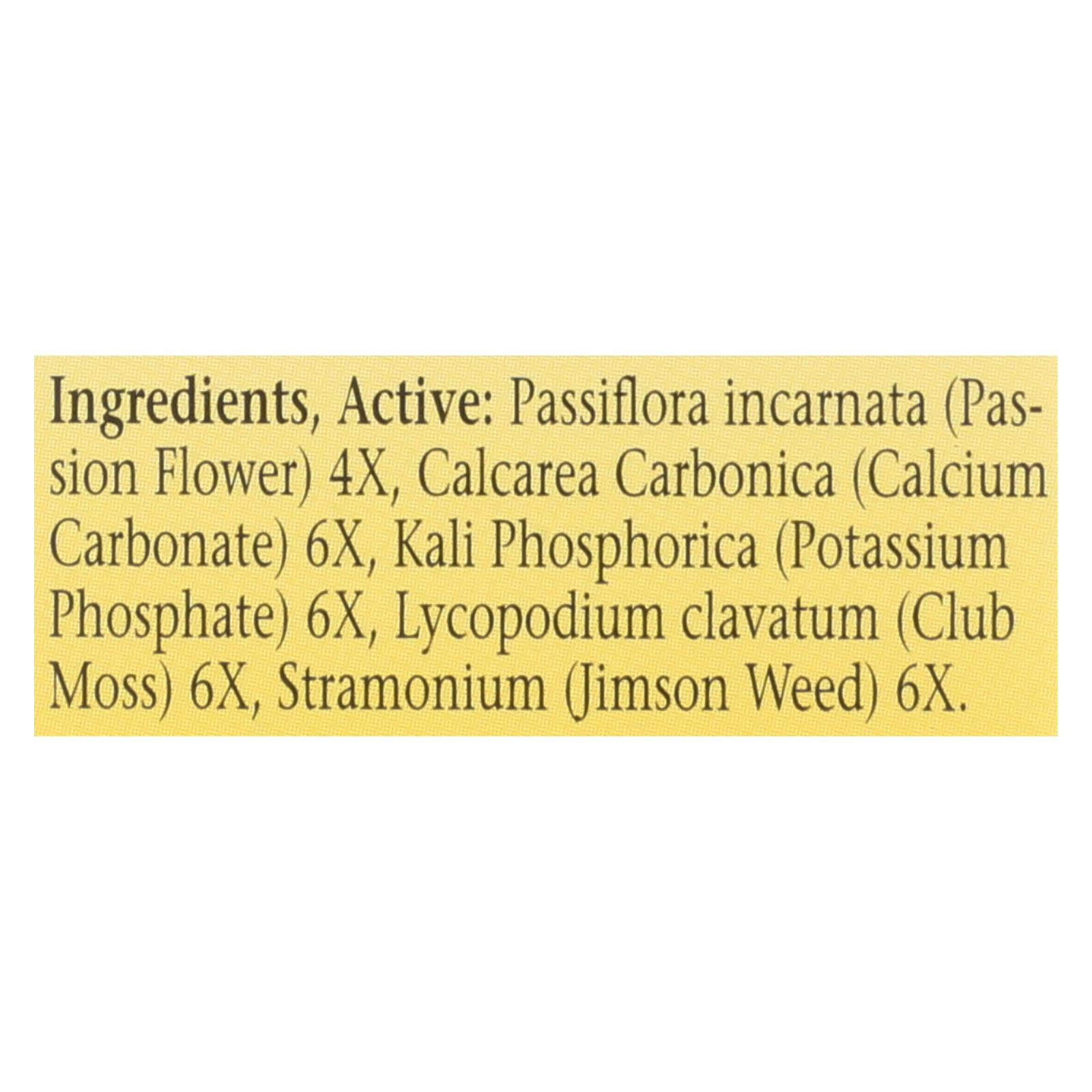 ingredients : cellulose;dextrose;lactose;magnesium stearate;natural banana flavor;passiflora incarnata;passion flower;4x;calcarea carbonica;calcium carbonate;6x;kali phosphorica;potassium phosphate;lycopodium clavatum;club moss;stramonium;jimson weed