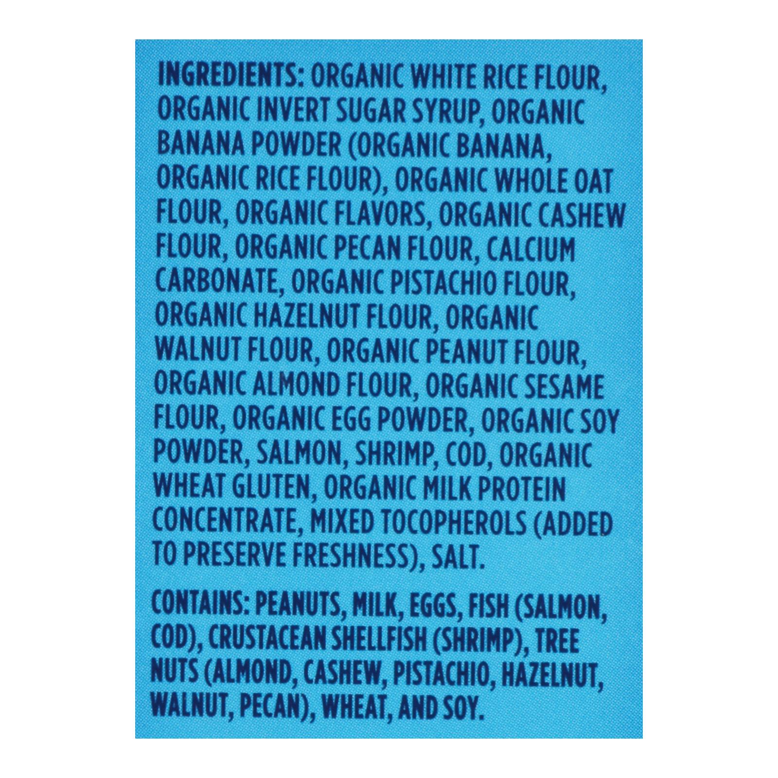 ingredients : organic white rice flour;organic invert sugar syrup;organic banana powder (organic banana, organic rice flour);organic whole oat flour;organic flavors;organic cashew flour;organic pecan flour;calcium carbonate;organic pistachio flour;organic hazelnut flour;organic walnut flour;organic peanut flour;organic almond flour;organic sesame flour;organic egg powder;organic soy powder;salmon;shrimp;cod;organic wheat gluten;organic milk protein concentrate;mixed tocopherols (added to preserve freshness);s