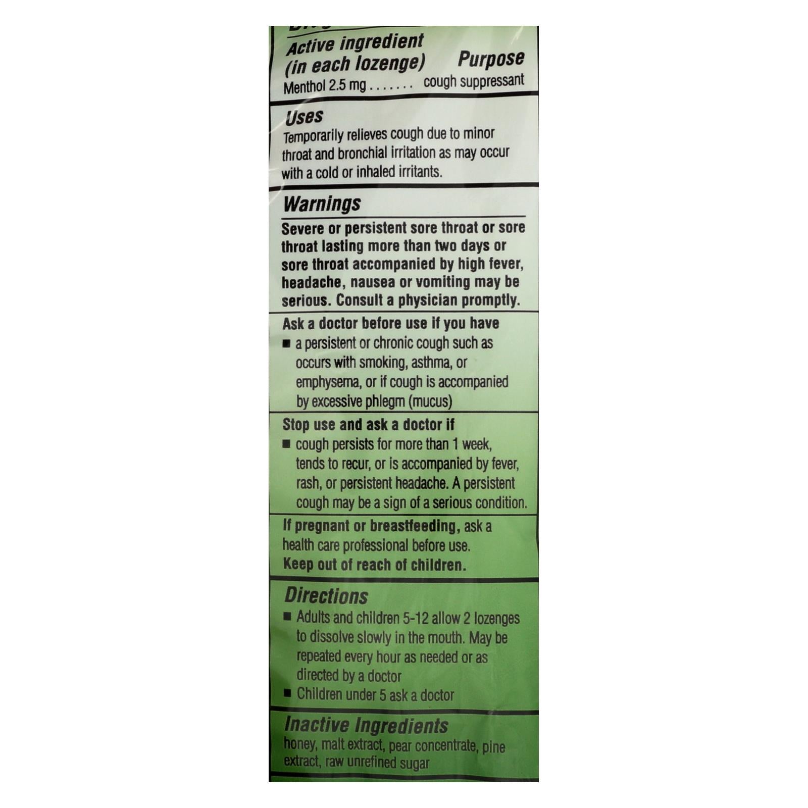 ingredients : menthol 5 mg honey;malt extract;pear concentrate;pine extract;raw unrefined sugar