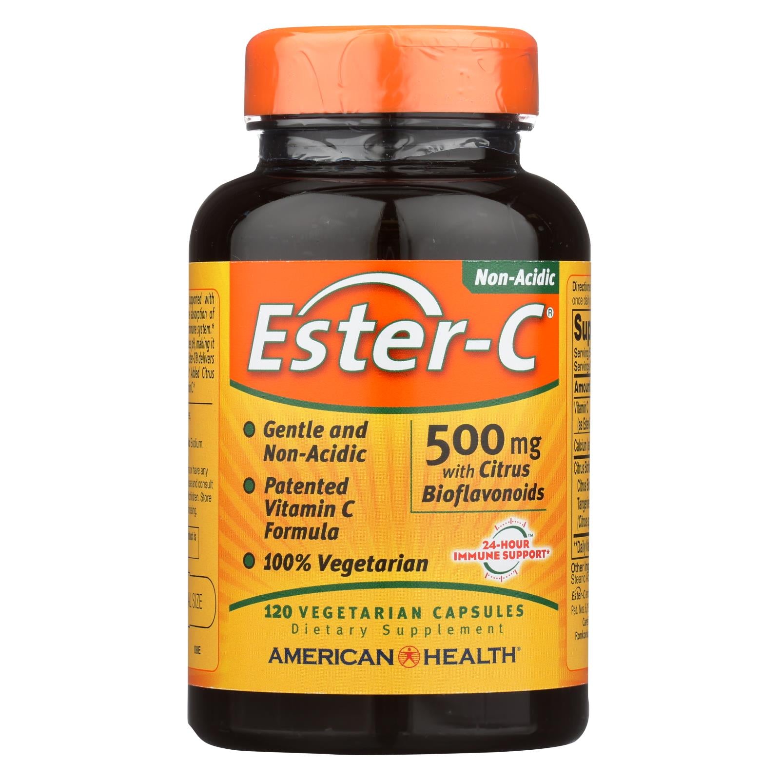 American health ester-c 500 mg. With citrus bioflavonoids is our breakthrough patented vitamin c formula supported with naturally occurring metabolites. Metabolites help enhance the absorption of vitamin c by your white blood cells and we use a unique, chemical-free manufacturing process that neutralizes ph which makes it non-acidic. Our gluten-free dietary supplement has a formula with no gmos and free of artificial flavors, colors and preservatives. There is no soy, sodium, lactose, milk and milk products and no sugar. Included is one bottle of 120 american health ester-c 500 mg. With citrus bioflavonoids vegetarian capsules. See nutrition facts panel for allergens. Good health does not need to be complicated. We understand the complex needs of a healthy lifestyle and develop supplements which work synergistically with your natural physiology to help promote proper balance and wellness.