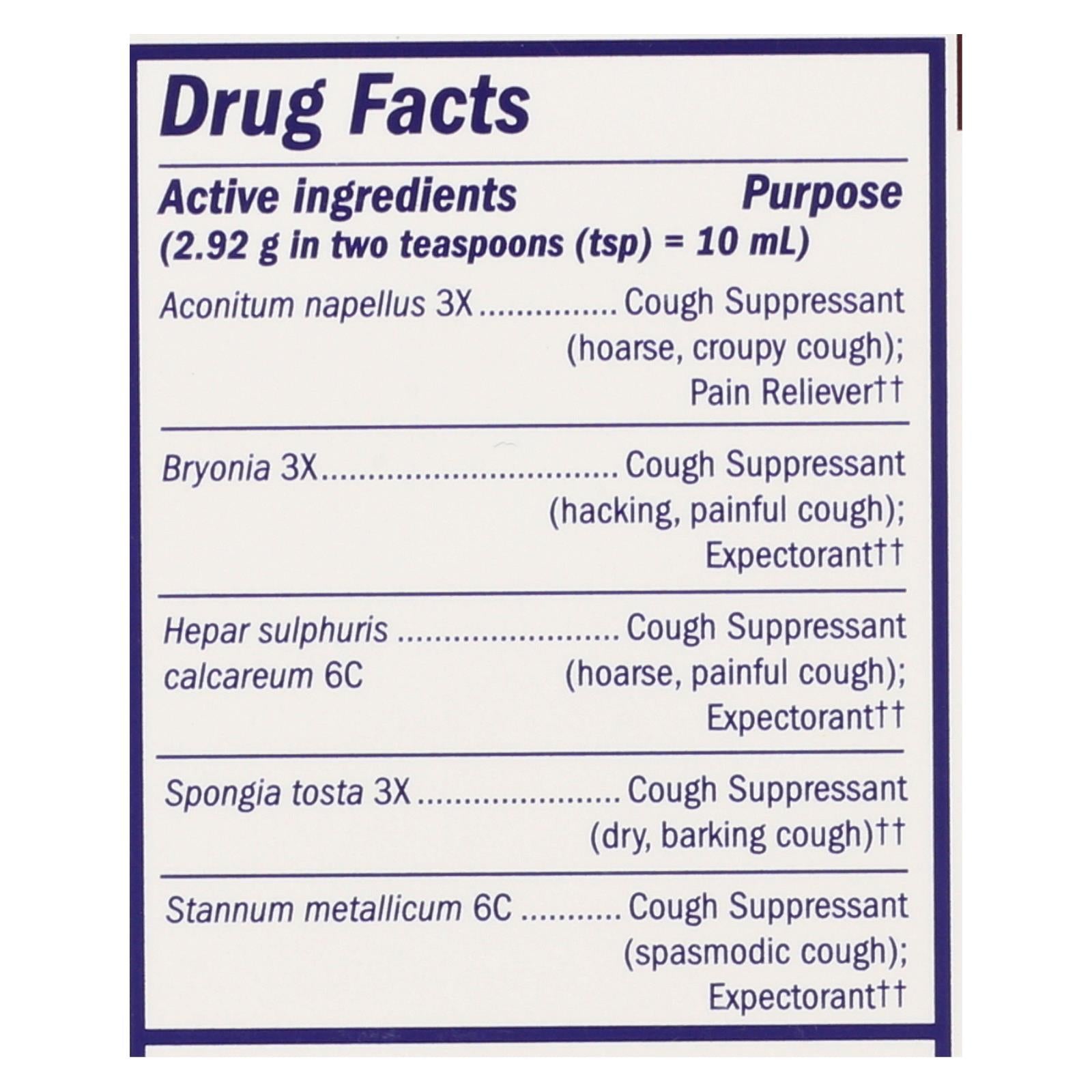 ingredients : drug facts active;hpus;in two teaspoons = 10 ml;aconitum napellus 3x purpose cough suppressant;hoarse;croupy cough;; pain reliever†† bryonia 3x purpose cough suppressant;hacking;painful cough;; expectorant†† hepar sulphuris calcareum 6c purpose cough suppressant;; expectorant†† spongia tosta 3x purpose cough suppressant;dry;barking cough;†† stannum metallicum 6c purpose cough suppressant;spasmodic cough;; expectorant††;inactive citric acid;gum arabic;malt extract;purified water;sodium benzoate;
