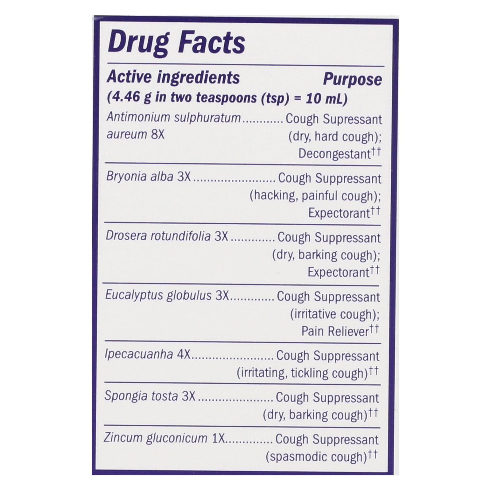 ingredients : 4.46 g in two teaspoons;tsp;= 10 ml;antimonium sulphuratum aureum 8x purpose cough supressant;dry;hard cough;; decongestant†† bryonia alba 3x purpose cough suppressant;hacking;painful cough;; expectorant†† drosera rotundifolia 3x purpose cough supressant;barking cough;; expectorant†† eucalyptus globulus 3x purpose cough suppressant;irritative cough;; pain reliever†† ipecacuanha 4x purpose cough suppressant;irritating;tickling cough;†† spongia tosta 3x purpose cough suppressant;†† zincum gluconic