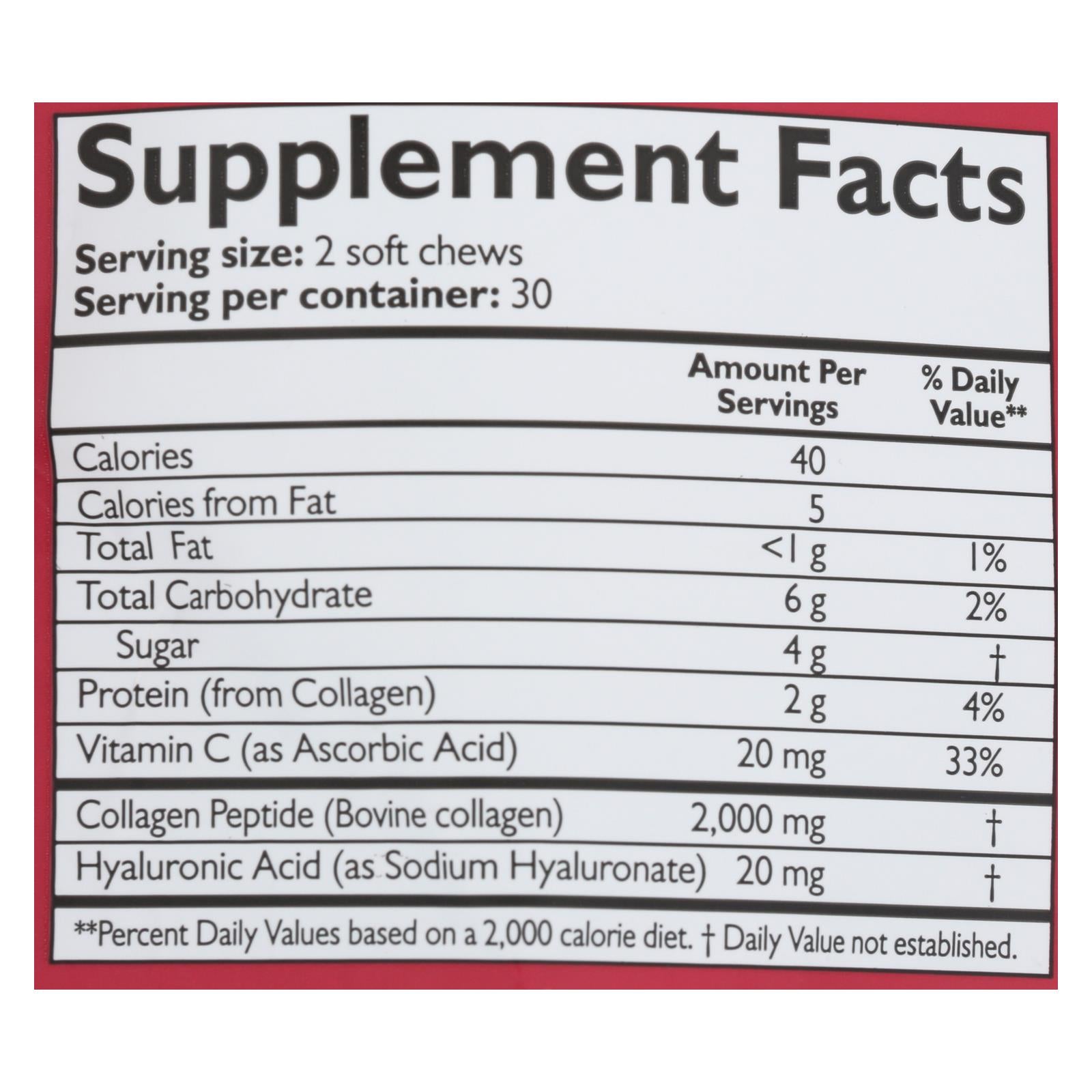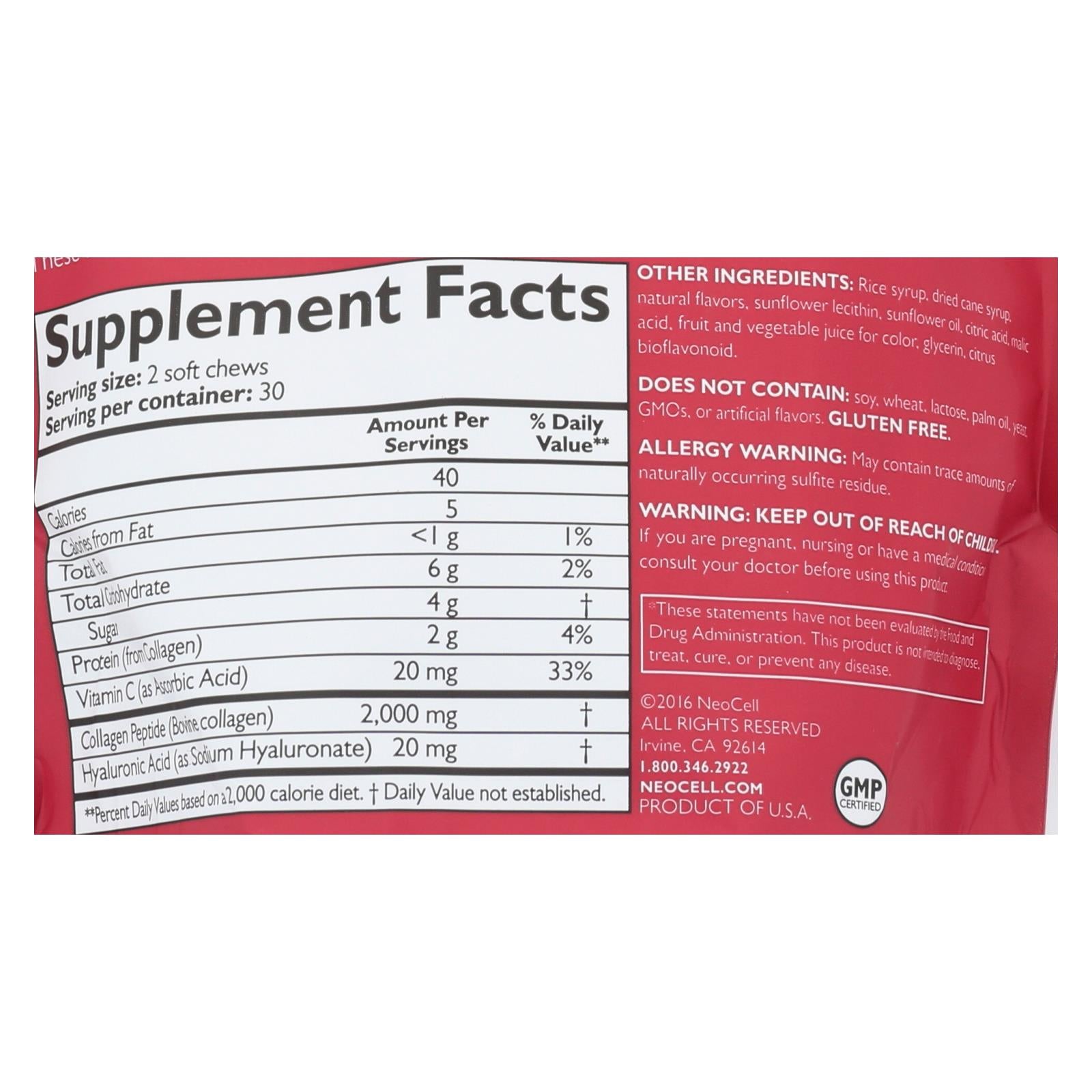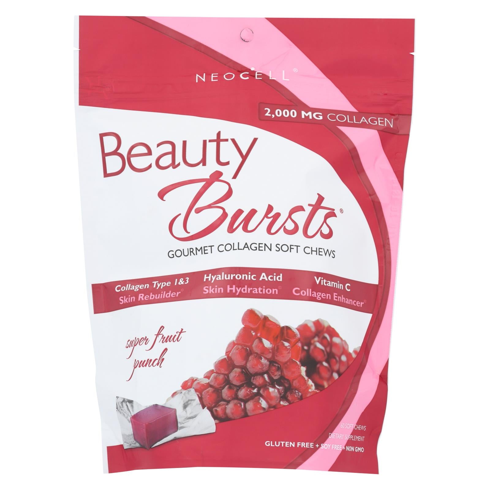 Neocell beauty bursts, super fruit punch are all-natural chewable supplements that are intended to hydrate, renew and smooth the skin as well as strengthen hair and nails. These delicious supplements are gluten-free and do not contain lactose, yeast, starch or artificial flavors. Each pouch of neocell beauty bursts, super fruit punch contains 60 soft chews.