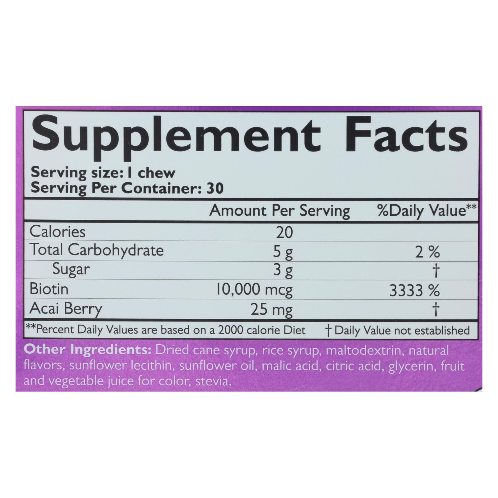 Neocell biotin bursts, brazilian acai berry are all-natural chewable supplements that are intended for vibrant skin, lustrous hair and resilient nails. These delicious supplements are gluten-free and do not contain lactose, yeast or artificial flavors. Each gable top box of neocell biotin bursts, brazilian acai berry contains 30 soft chews.