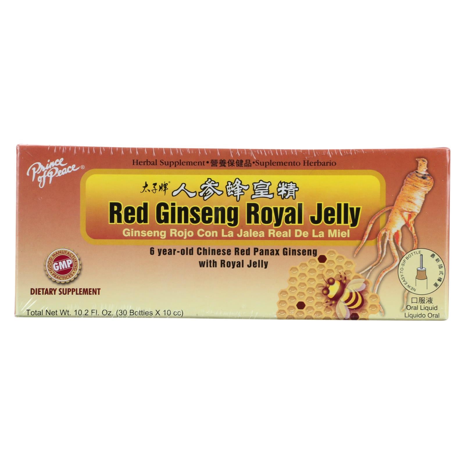 Prince of peace red ginseng royal jelly dietary supplement comes from traditional chinese medicine that believes red panax ginseng enhances your body's natural energy production and resistance to stress. Our formula starts with 6-year-old red ginseng and adds rich royal jelly honey for a liquid you can eat on its own or add to your favorite drinks. Each box contains 10.2 fl. Oz and 30 individual vials at 0.34 fl. Oz. Per vial.