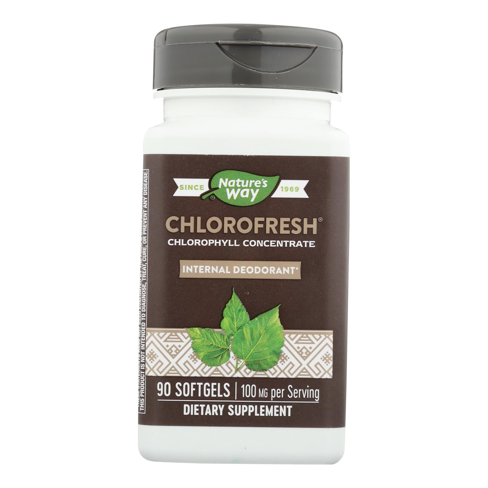 Nature's way chlorofresh chlorophyll concentrate softgels act as an internal deodorant formulated to cut down on odors in the digestive tract. Premium botanicals go into the mix to provide a supplement based on nature. This 90-count bottle contains 45 servings of concentrated chlorophyll complex in an easy-to-swallow softgel format. It's designed for adults and kids age 12 and older.