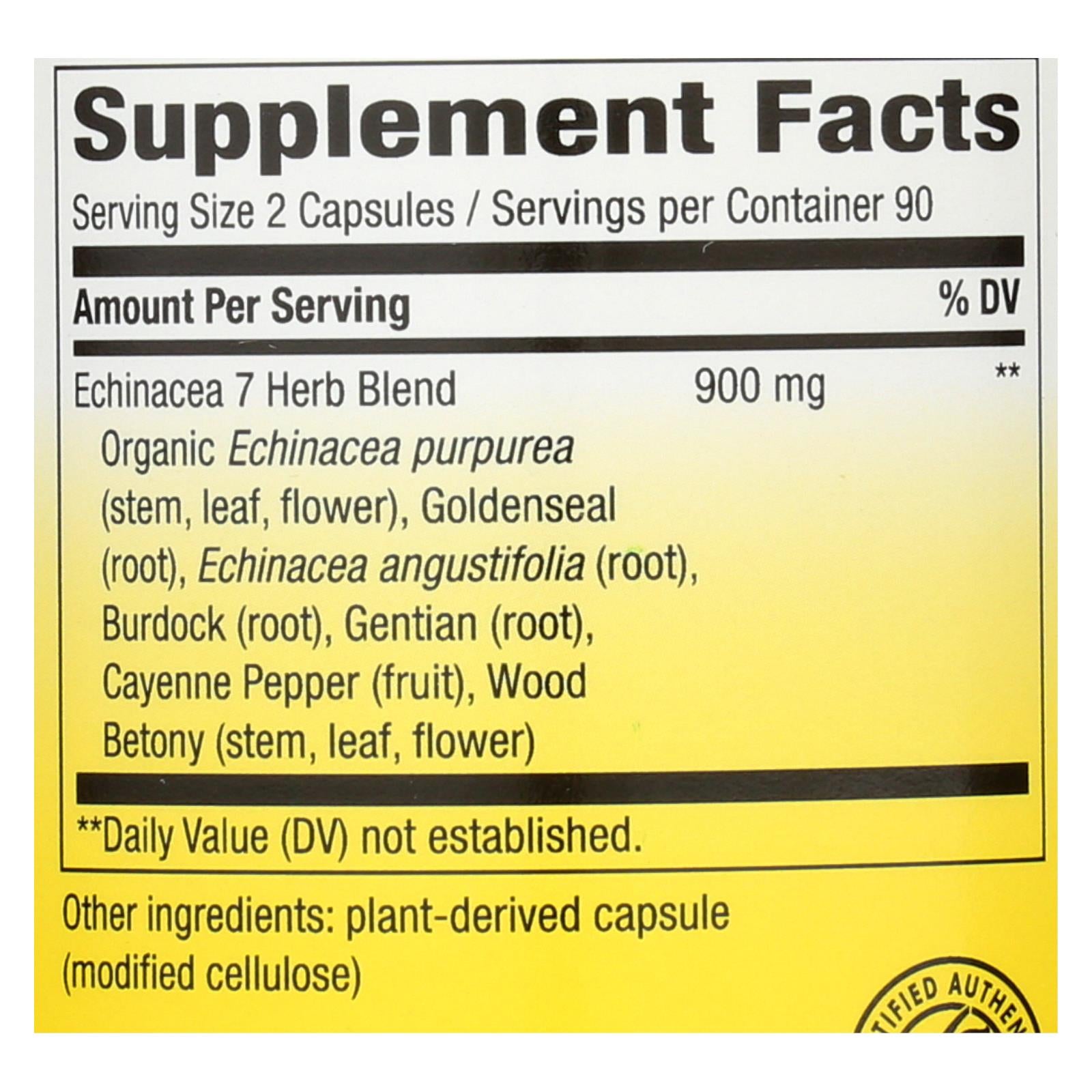 Nature's way echinacea-goldenseal immune is a unique blend of seven herbs to help support immune health. It features a blend of herbs including: organic echinacea, goldenseal, echinacea, burdock, gentian, cayenne pepper and wood betony. Each 180-capsule bottle of echinacea-goldenseal immune provides ninety 2-capsule servings of echinacea blend. Each serving delivers 900 mg. Of echinacea. Nature's way echinacea-goldenseal is non-gmo project verified, vegetarian and gluten-free.