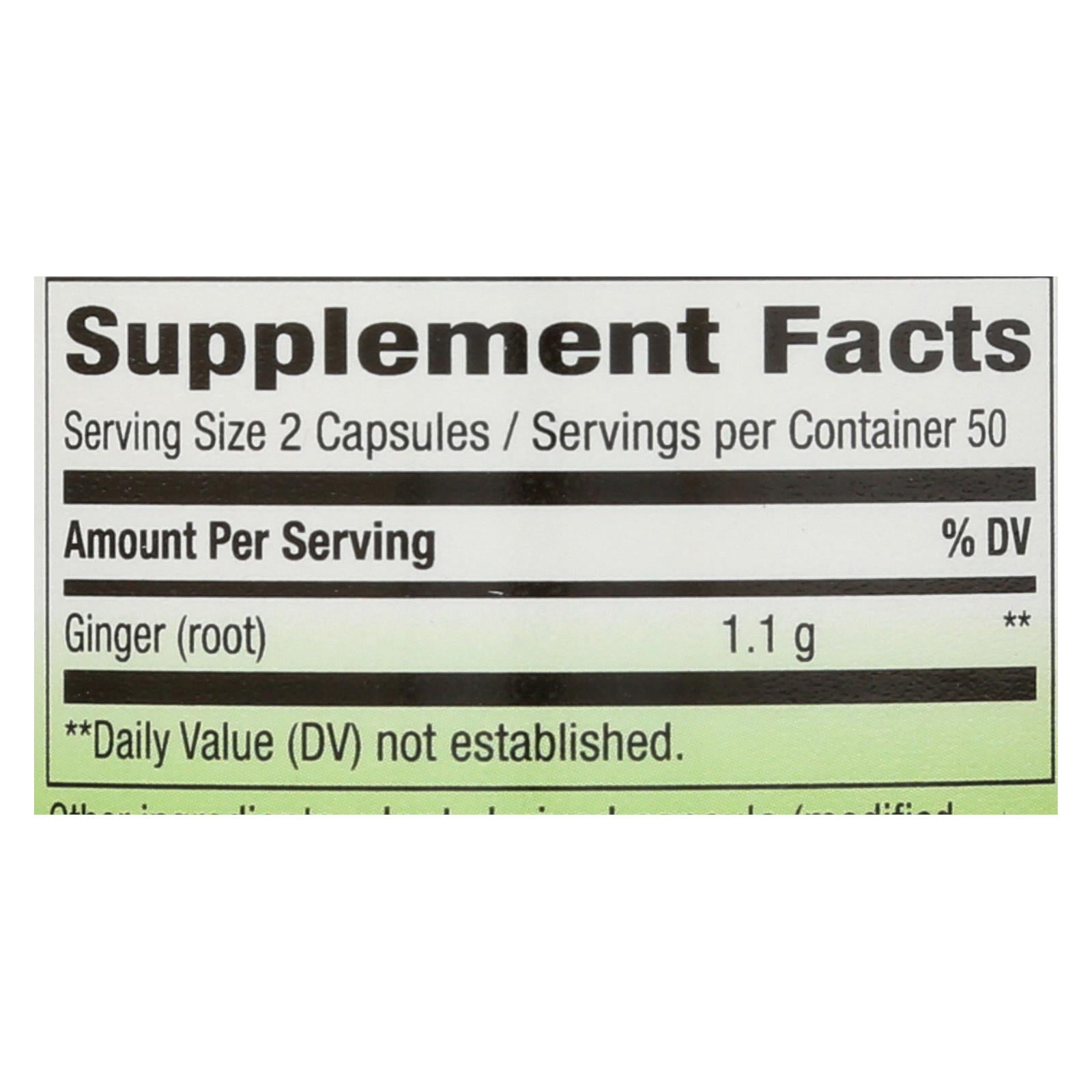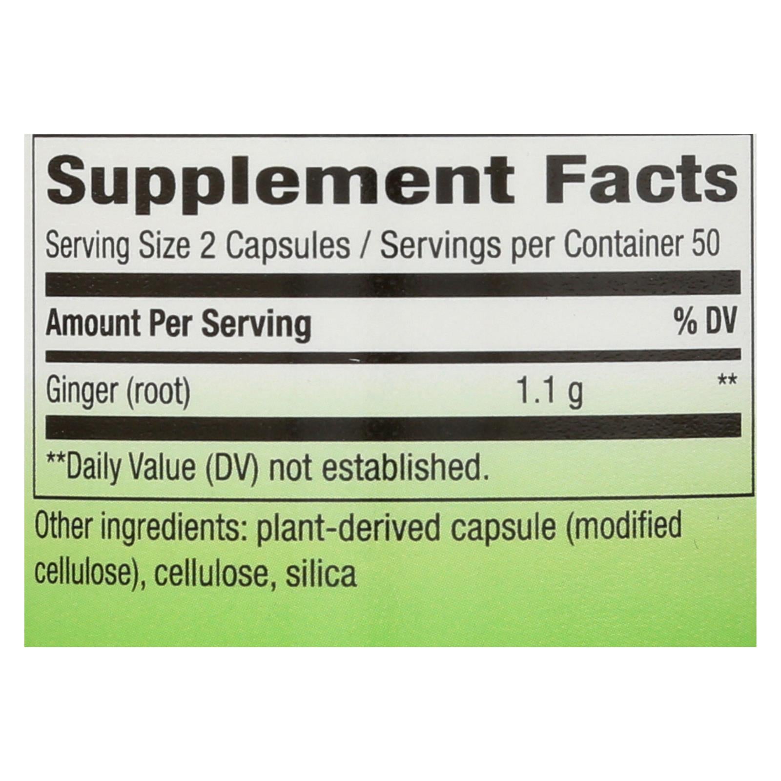 Nature's way ginger root capsules contain 550 mg of ground ginger. We manufacture our ginger root capsules using materials that are not genetically modified. These capsules are made from plant-based materials and are suitable for vegetarian diets. This package contains 100 ginger root capsules, which equates to 50 two-capsule servings.