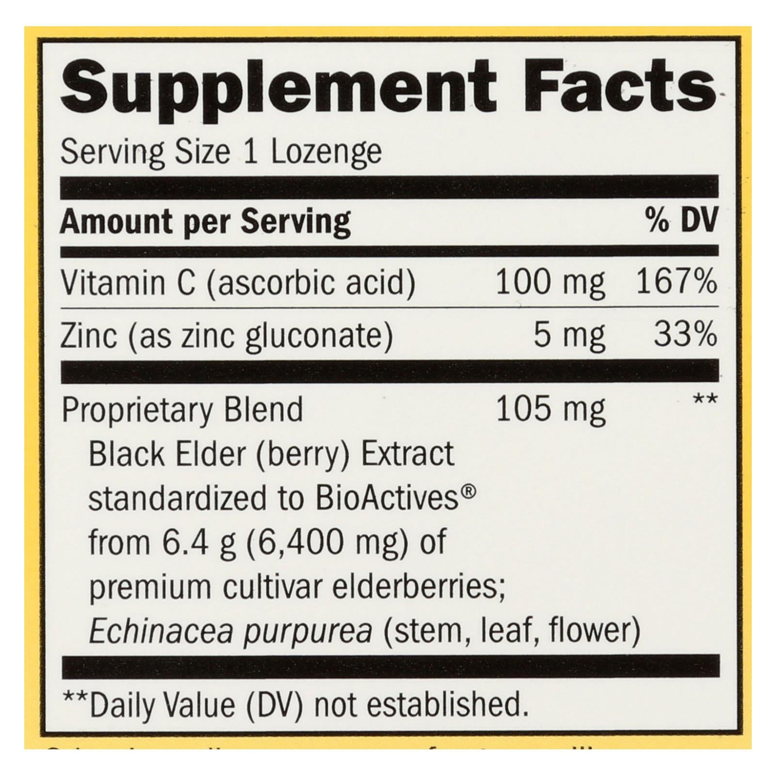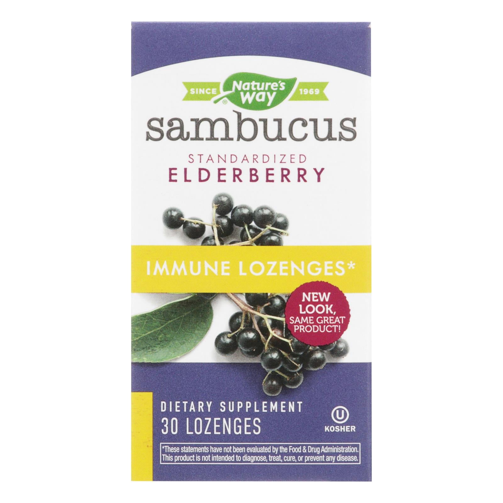 Nature's way sambucus immune standardized elderberry lozenges contain a proprietary blend of elderberry extracts and echinacea. We manufacture our lozenges using a premium elderberry cultivar. As a dietary supplement, these lozenges provide vitamin c and zinc. This package contains 30 elderberry lozenges.