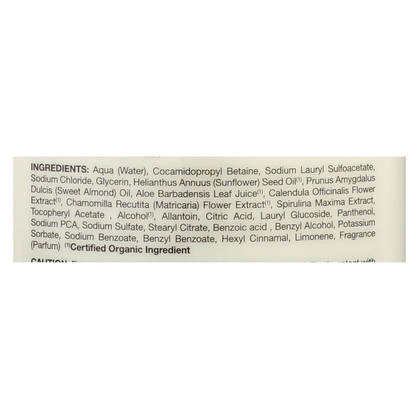 ingredients : aqua;water;cocamidopropyl betaine;sodium lauryl sulfoacetate;sodium chloride;glycerin;helianthus annuus;sunflower;seed oil;¹;prunus amygdalus dulcis;sweet almond;oil;aloe barbadensis leaf juice;calendula officinalis flower extract;chamomilla recutita;matricaria;flower extract;spirulina maxima extract;tocopheryl acetate;alcohol;allantoin;citric acid;lauryl glucoside;panthenol;sodium pca;sodium sulfate;stearyl citrate;benzoic acid;benzyl alcohol;potassium sorbate;sodium benzoate;benzyl benzoate;he
