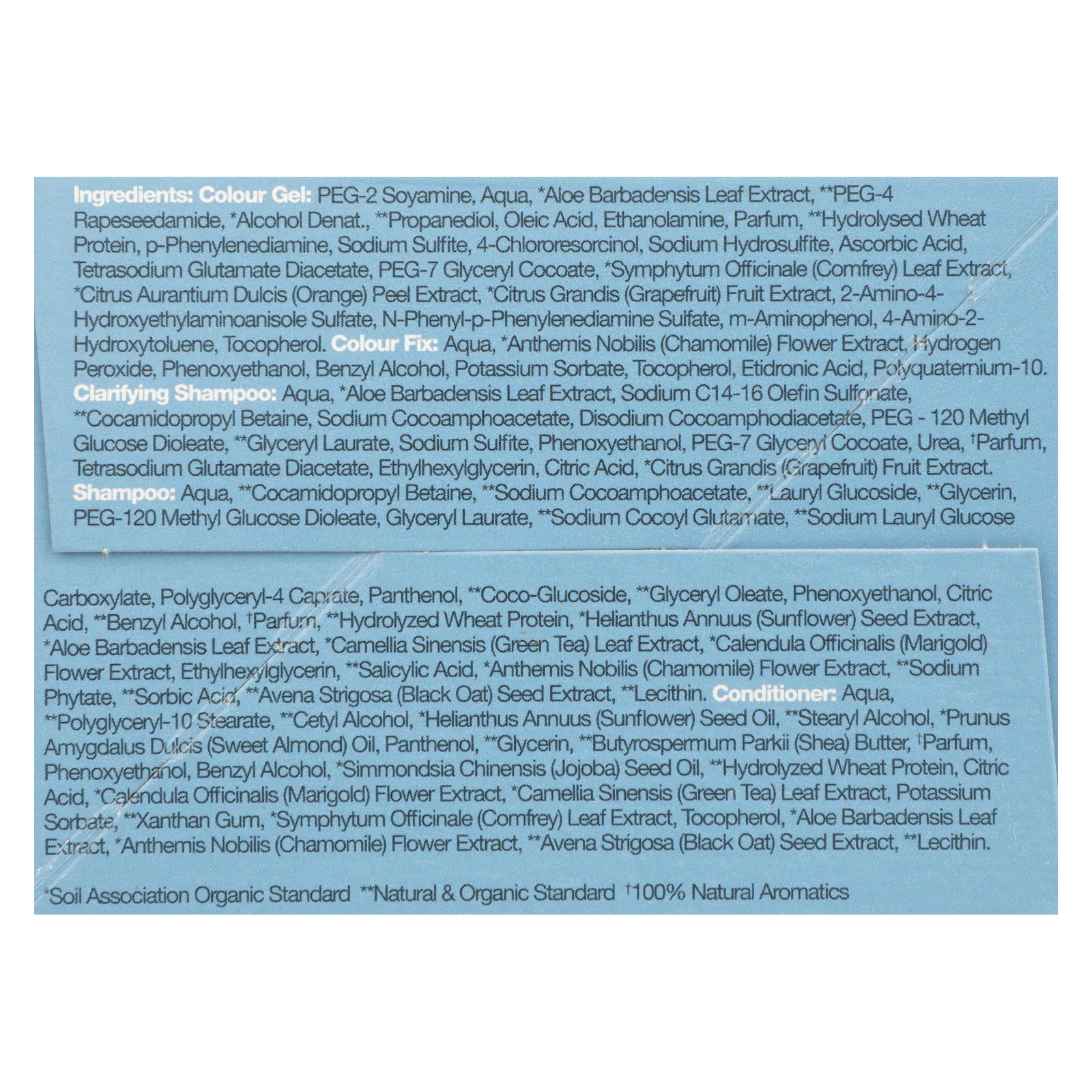 ingredients : colour gel: peg-2 soyamine;aqua;aloe barbadensis leaf extract;peg-4 rapeseedamide;alcohol denat;propanediol;oleic acid;ethanolamine;parfum;hydrolysed wheat protein;p-phenylenediamine;sodium sulfite;4-chlororesorcinol;sodium hydrosulfite;ascorbic acid;tetrasodium glutamate diacetate;peg-7 glyceryl cocoate;symphytum officinale;comfrey;leaf extract;citrus aurantium dulcis;orange;peel extract;citrus grandis;grapefruit;fruit extract;2-amino-4-hydroxyethylaminoanisole sulfate;n-phenyl-p-phenylenediami